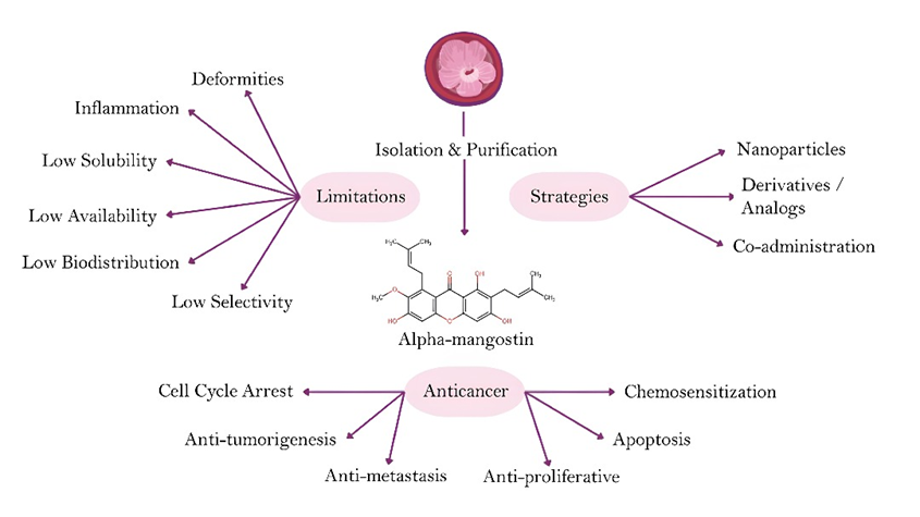 Graphical abstract. Alpha-mangostin exerts anticancer effects by regulating cell cycle arrest, inhibiting tumorigenesis, metastasis, and cell proliferation, inducing apoptosis, and enhancing chemosensitivity. However, its therapeutic potential is limited by low solubility, bioavailability, and biodistribution, which could be improved through nanoparticle encapsulation, derivative synthesis, or combination with other chemotherapeutic agents.